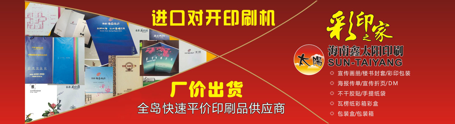 海南鑫太陽印刷業(yè)有限公司成立于2002年,主要從事生產(chǎn)海報畫冊、傳單簡介、精品包裝、掛歷臺歷、不干膠貼、手提紙袋、瓦楞紙包裝箱和彩箱紙盒等,公司有日本、德國等對開及四開高速彩色印刷機、自動膠裝機、自動鎖線機、自動復(fù)膜機等先進(jìn)的自動化設(shè)備,業(yè)務(wù)涉及商業(yè)、地產(chǎn)、水產(chǎn)、食品、農(nóng)林、藥品、化工、航空等行業(yè)的彩印包裝及宣傳印刷品。我公司另外還設(shè)有紙箱包裝廠,可以更好地為客戶配套生產(chǎn)各種檔次級別的瓦楞紙箱彩盒、普通紙箱紙盒、精裝禮盒等大型產(chǎn)品包裝,產(chǎn)品范圍包括花炮箱、飲料箱、食品箱、魚箱、花箱等。